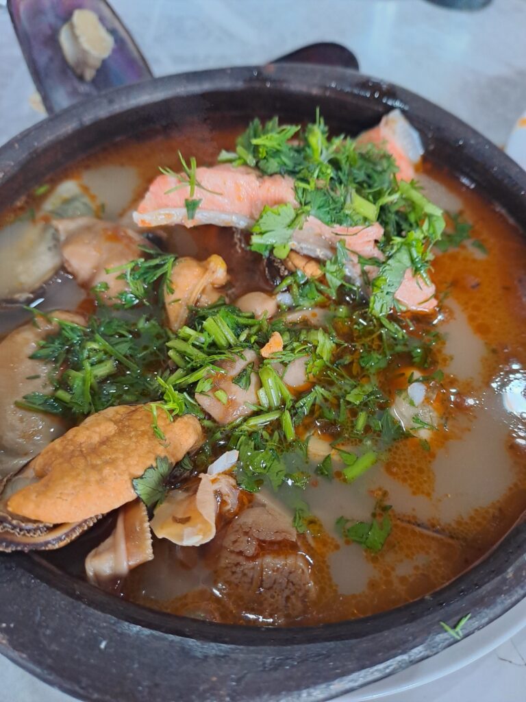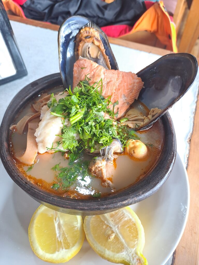 Nous choisissons le restaurant qui est en hauteur, au-dessus de l’océan (dommage qu’il fasse mauvais, la vue doit être superbe!!). Le poêle est allumé, il y a du monde, l’ambiance est familiale et chaleureuse. Nous commandons trois parillas de poisson (soupe très épicée avec du poisson, des fruits de mer et de la coriandre). C’est un vrai délice, nous nous régalons.
