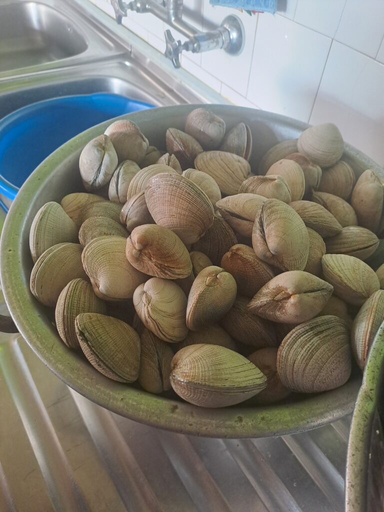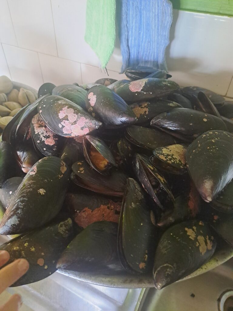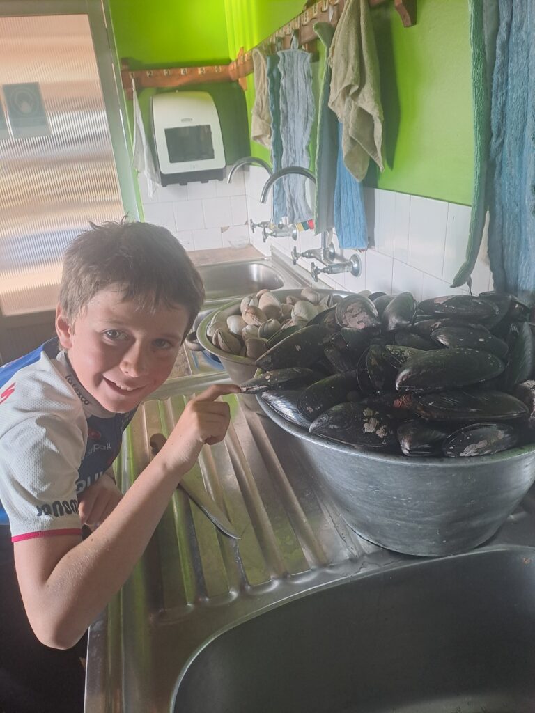 Paul et Caroline vont faire les courses : ils prévoient de quoi faire des croque-monsieurs. Nous dînons tôt. Paul est content car les dames du service cuisine ont laissé des coquillages vivants dans de grands bacs. Ceux-ci font du bruit, Paul essaie de voir leurs réactions quand il les touche!