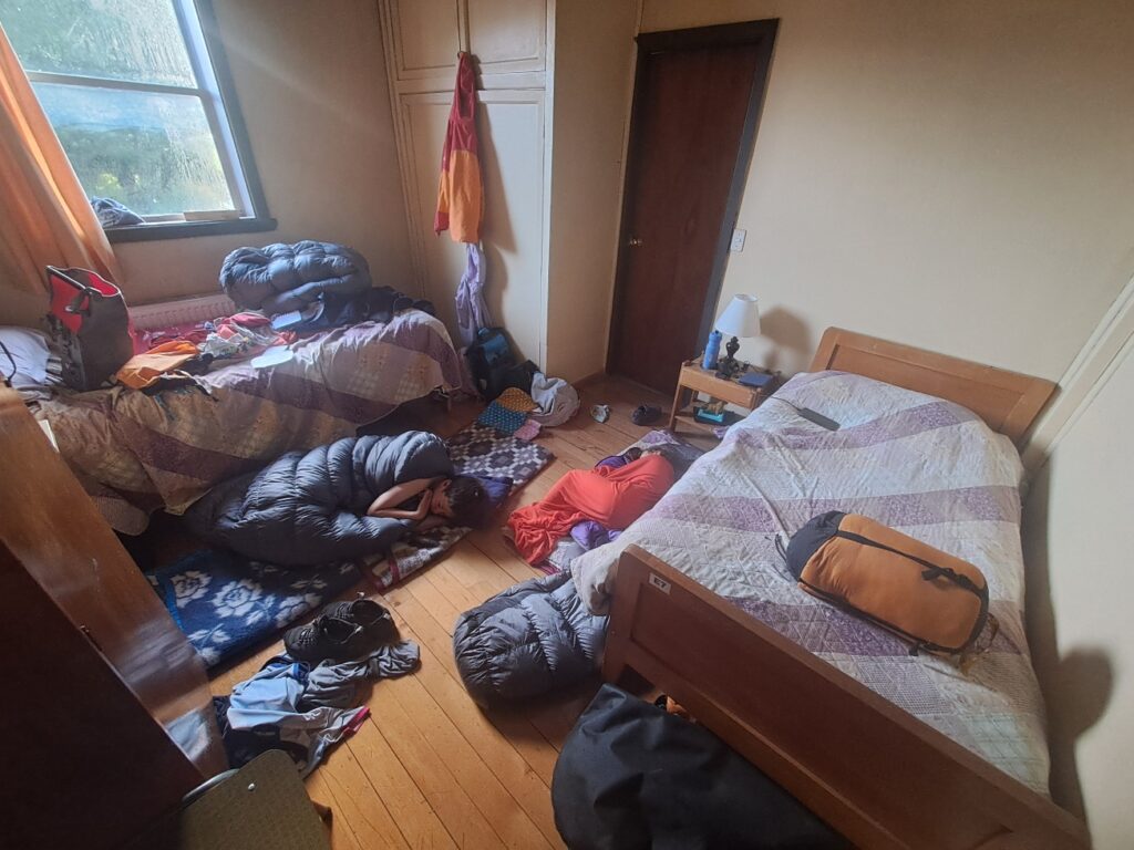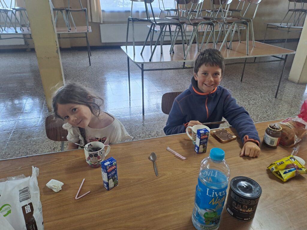 Ce matin, nous repartons en sens inverse : nous avons 3 jours pour faire ce que nous avons fait la semaine dernière. La nuit au pensionnat s’est bien passée. Nous nous levons vers 7h pour prendre notre petit déjeuner avant 8h, heure à laquelle le personnel de l’école arrive. Paul et Marie préfèrent rester au chaud dans leur duvet pour le moment!