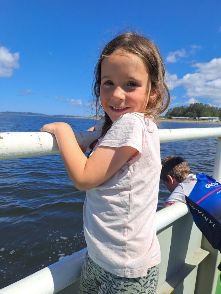 Nous pédalons assez vite et après 25 kilomètres, nous devons prendre le bac pour 1 kilomètre pour traverser un petit bras de mer. Le bac vient de partir, nous devons patienter environ 30 minutes. Nous apprenons que nous avons de la chance car le prochain bac partira seulement 1h après le nôtre car ils sont en pause déjeuner ! Nous montons donc dans notre bac, nous allons pouvoir déjeuner de l’autre côté.
