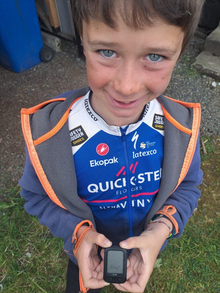 Nous pique-niquons donc à La Pasada, nous prenons notre temps. L’après-midi est plus difficile : nous retrouvons nos « amies » les grandes montées suivies de jolies descentes. Cela nous empêche d’avoir un vrai rythme, nous pouvons filer à toute allure dans la pente et avancer comme des tortues dans les montée! Heureusement, pour la plus grande joie de Paul, aujourd’hui nous avons battu notre record de vitesse !!! 69 kms/heure pour Marie et Thomas, 64,2 kms/heure pour Paul et Caroline ! Cela nous apporte une petite fierté quand même!