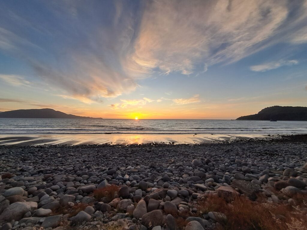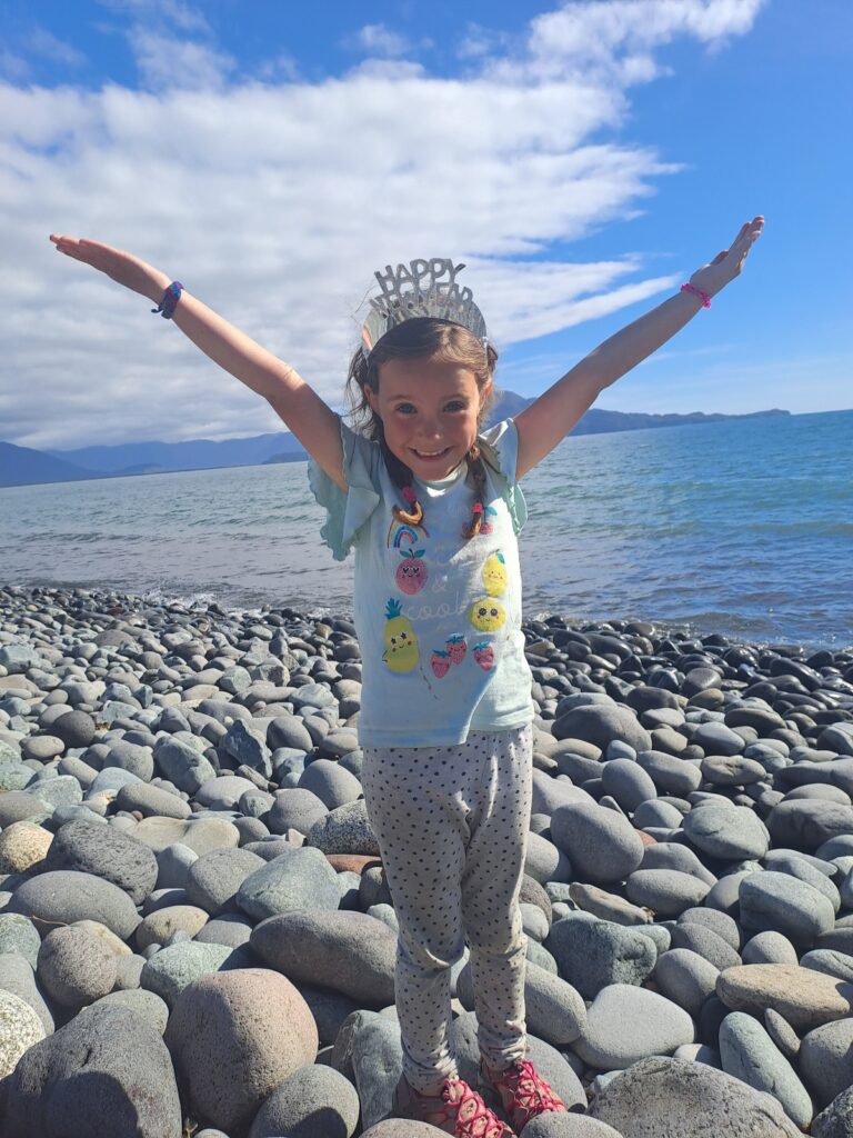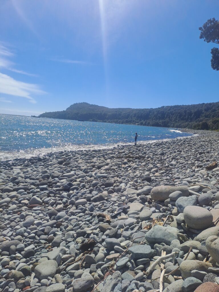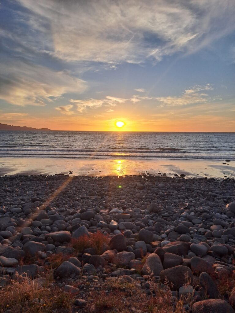Après le déjeuner, nous profitons du lieu pour nous reposer un peu. Les enfants sont contents de jouer sur la plage de galets. Du monde arrive et s’installe pour l’après-midi ou pour la nuit. Paul joue avec des jeunes aux raquettes de plage. Marie observe les dauphins et les otaries jouer dans l’eau. Nous sommes vraiment bien ici, notre meilleur camping depuis le début du voyage! Quoi de mieux pour commencer l’année !!