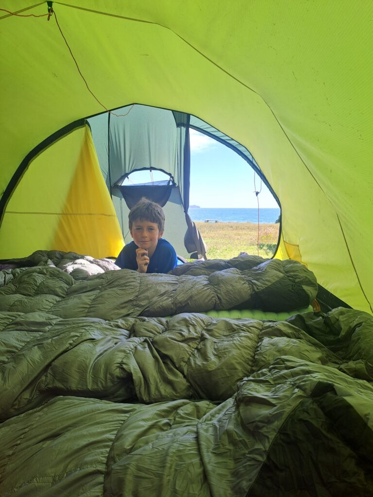 Nous regagnons ensuite la tente car la fraîcheur tombe vite et il est déjà 22h. Nous nous endormons bercés par le bruit des vagues, la vie est belle.