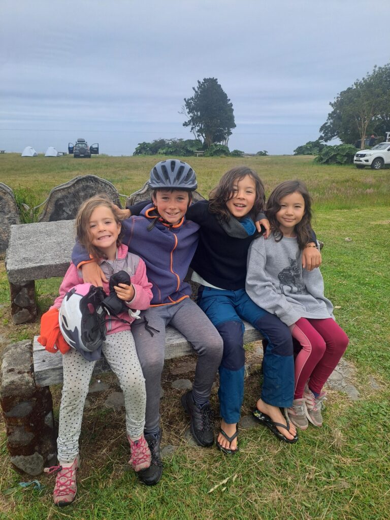 Nous avons dormi bercés par le bruit des vagues, quel bonheur. Nous nous levons tranquillement vers 8h. Petit déjeuner dans la salle commune, au chaud. Nous rangeons ensuite nos affaires. Paul et Marie en profitent pour jouer avec Célia et Jolan qui sont arrivés hier soir au camping (ils sont français et vivent à Conception au Chili).