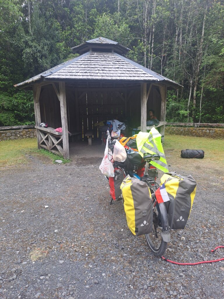 Nous finissons par arriver au camping Lago Negro. C’est un camping en pleine nature, sans réception (on ne paye que si le garde forestier passe au moment où nous y sommes!!). C’est assez rudimentaire (douche froide pour les plus motivés !!) mais comme nous sommes les premiers arrivés, nous pouvons profiter d’un abri pour cuisiner et manger! Il pleut un petit crachin à notre arrivée, nous sommes donc contents de pouvoir nous y abriter!