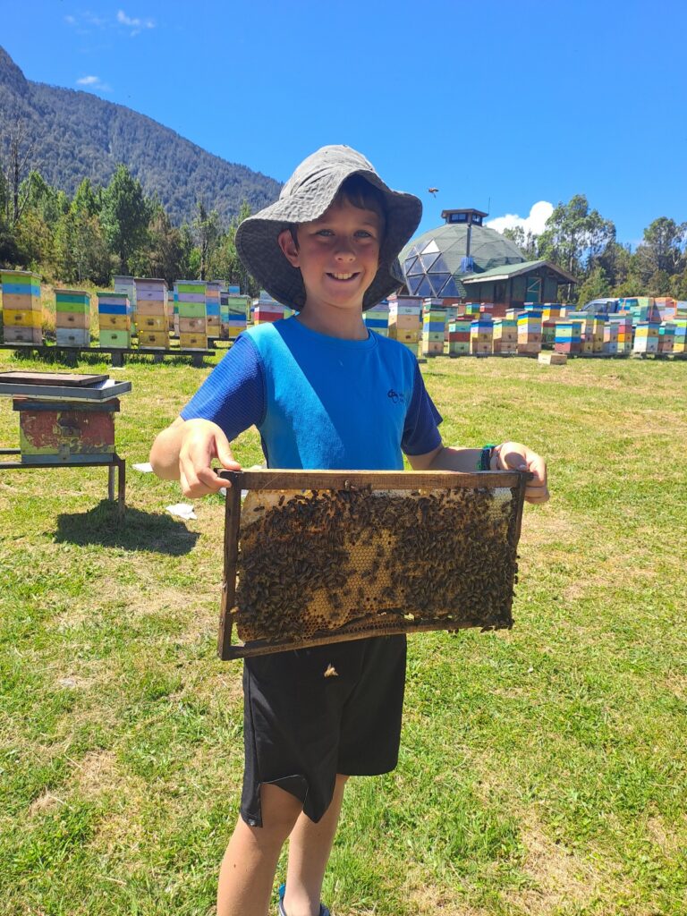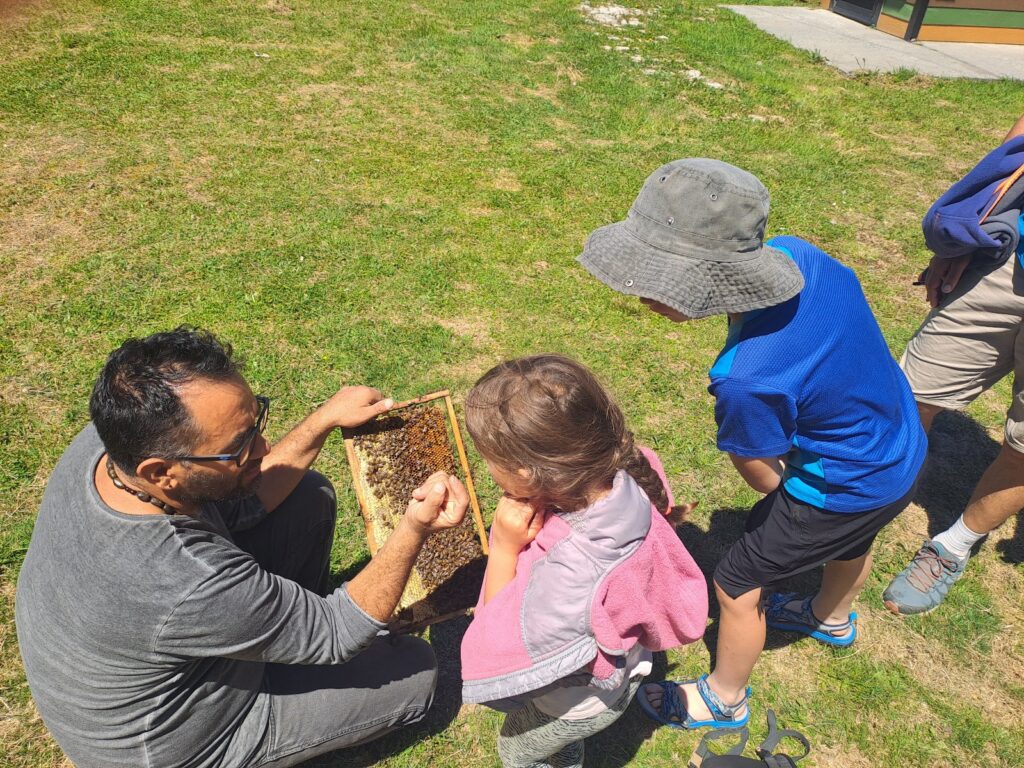 Nous passons un moment avec l’apiculteur qui nous présente le fonctionnement d’une ruche. Il travaille sans gants et sans tenue! La ruche que nous observons est très calme. Les enfants aperçoivent même la reine. Paul et Caroline tiennent un cadre, même pas peur!! Il nous montre les alvéoles de miel, de pollen, de couvain et celles où sont les futurs mâles.