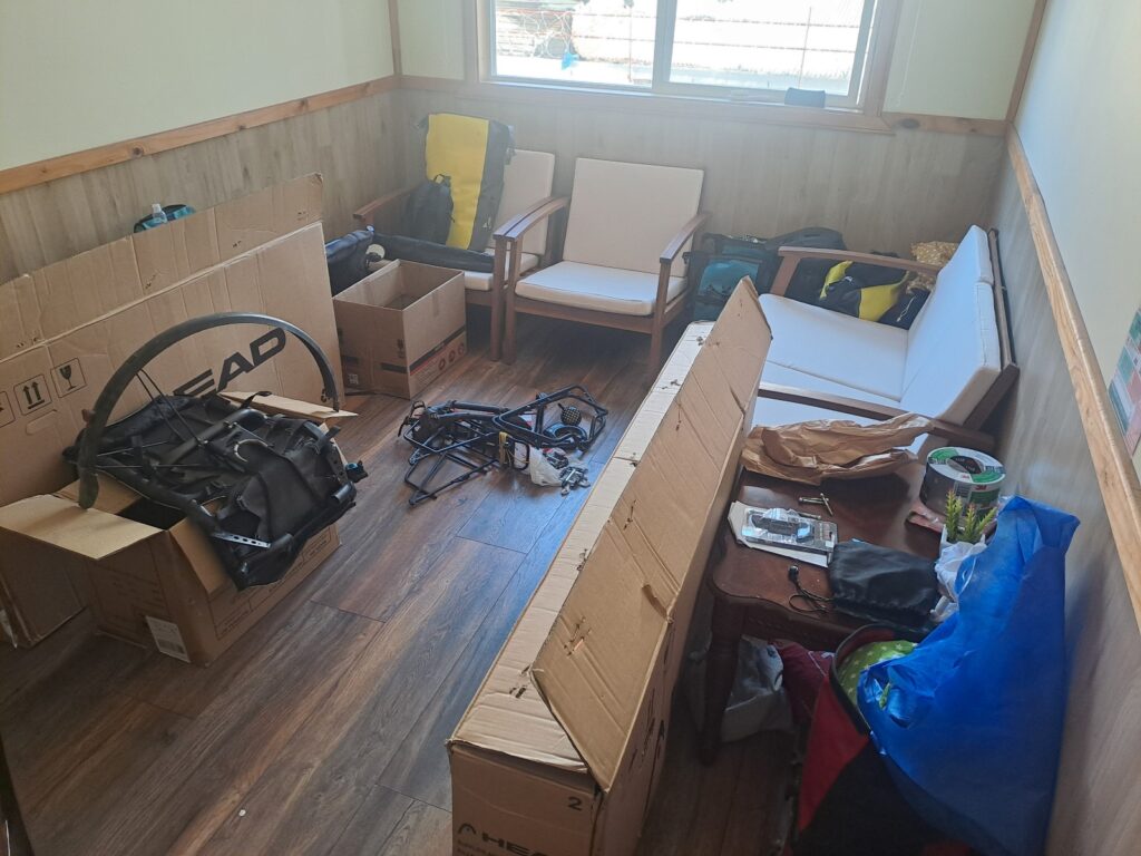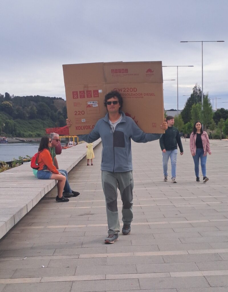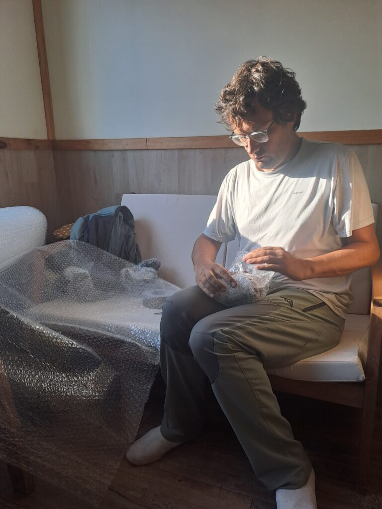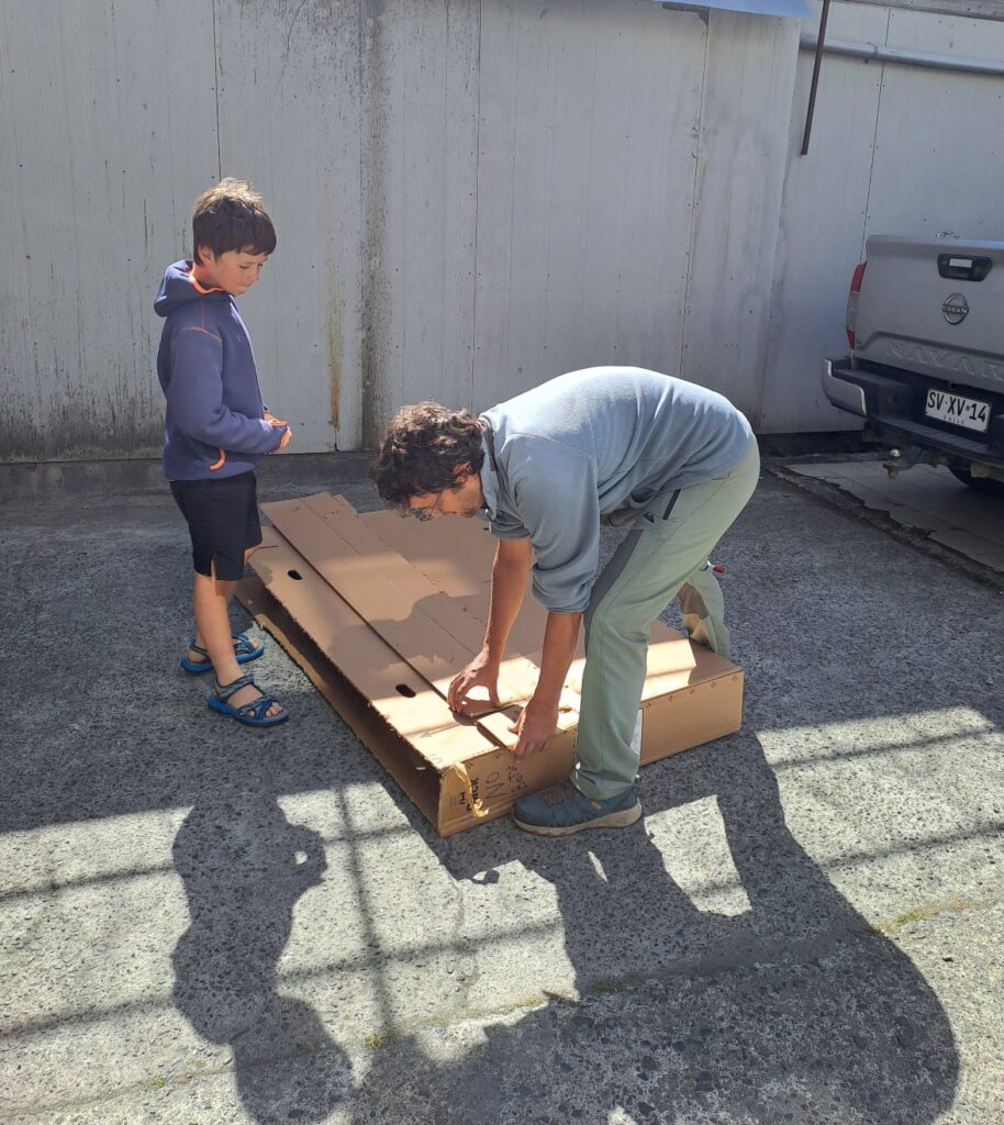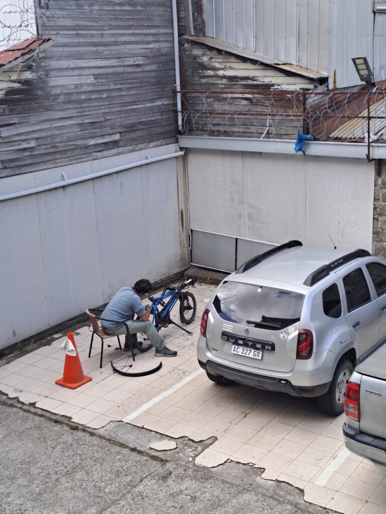 On fait les cartons : trouver les cartons (et jouer un peu avec !), démonter les vélos, les mettre dans les cartons, scotcher, enrubanner, protéger.. C’est du boulot mais Thomas gère ça d’une main de maître! Entre la cour de l’hôtel et l’appartement, on s’étale un peu, il y en a partout mais petit à petit, cela prend forme et samedi matin, les cartons sont prêts pour partir en bus direction Santiago !!