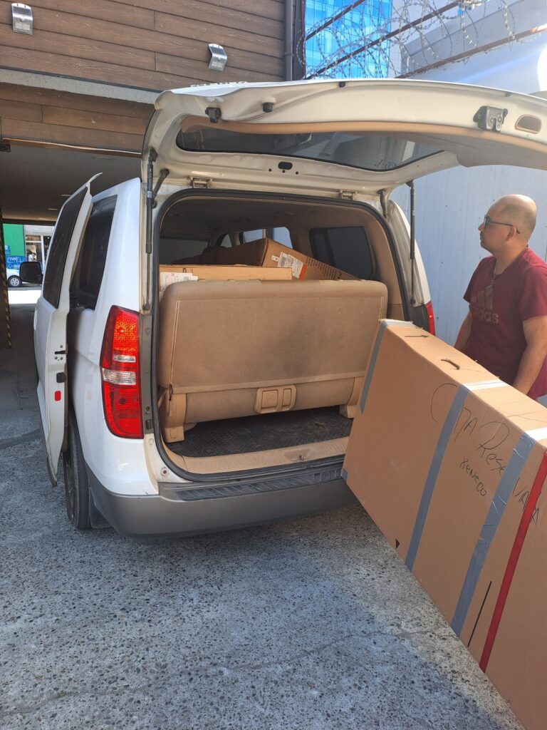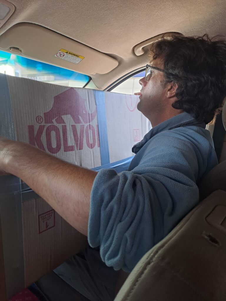 A notre arrivée au terminal, un monsieur vient avec son chariot pour nous aider à transporter toutes nos affaires. Quel joyeux bazar !