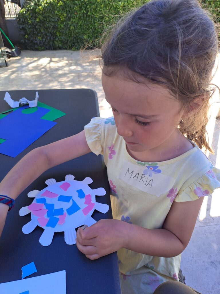 Marie se montre très appliquée. Elle utilise le matériel mis à sa disposition pour créer une jolie fleur.