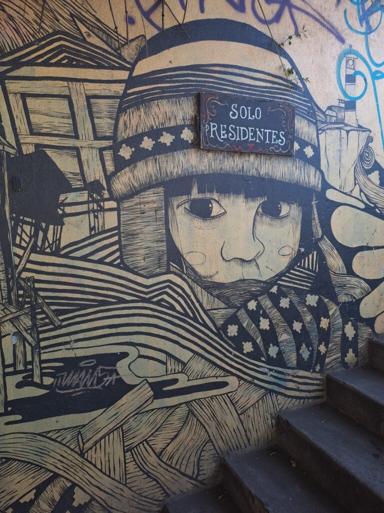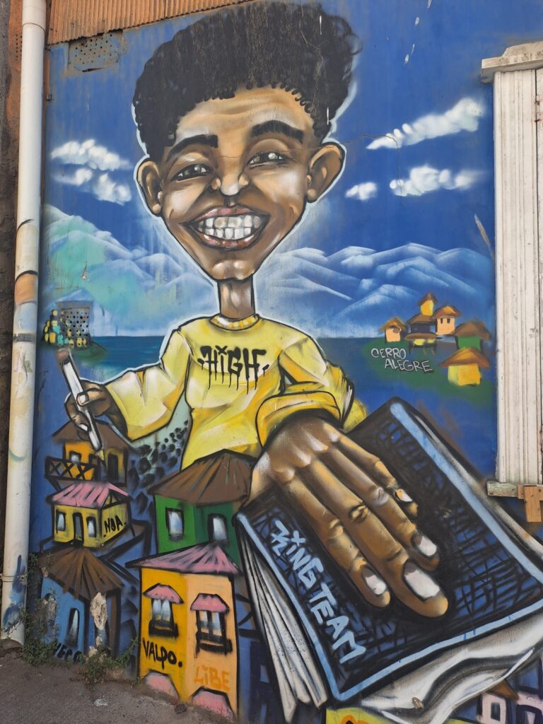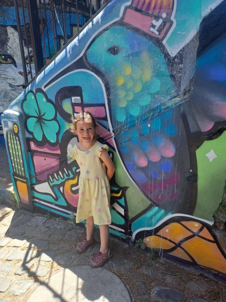 Après le temps calme, direction les rues colorées de Valparaiso. Nous apprécions de nous y perdre et de découvrir de nouveaux dessins plus beaux les uns que les autres. Les enfants courent, jouent, rient ensemble, nous marchons beaucoup encore aujourd’hui (Caroline a un podomètre sur son téléphone : 10700 pas ce qui équivaut environ à 8 kilomètres !).