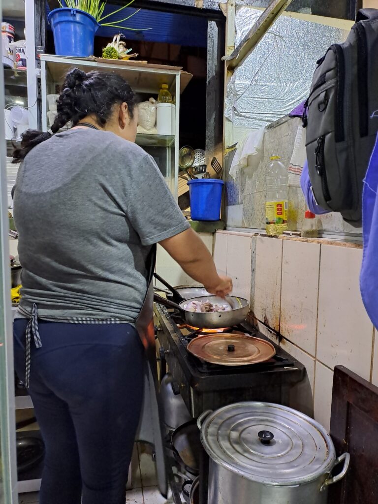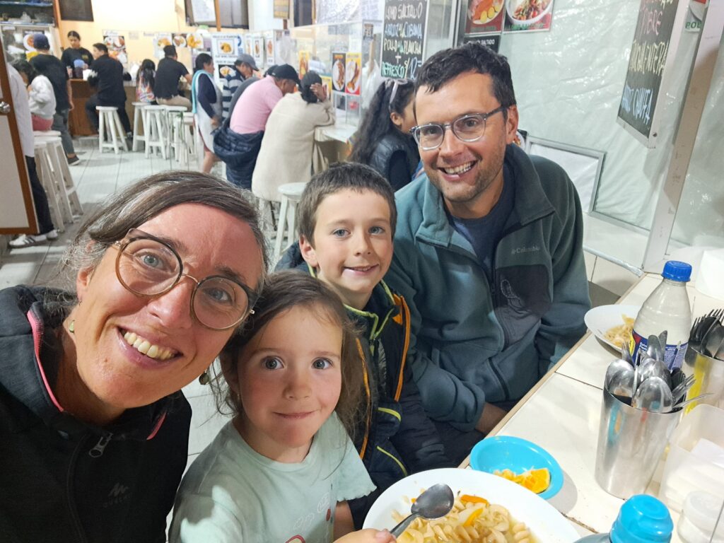 Pour finir la journée, petit dîner au marché d’Aguas Calientes. C’est vraiment le bon plan dans cette ville ultra touristique où tous les prix nous semblent exorbitants par rapport à la vie péruvienne classique. Nous prenons 3 menus composés d’une soupe et d’une assiette de lomo avec du riz et des légumes. Le menu coûte 12 soles, soit 4 euros. Et c’est un régal! L’ambiance du marché est aussi un moment chouette, où les cuisinières s’affairent à leur fourneau, les enfants gambadent partout et les chiens se baladent en espérant trouver quelques restes à grignoter. Nous nous y sentons bien!