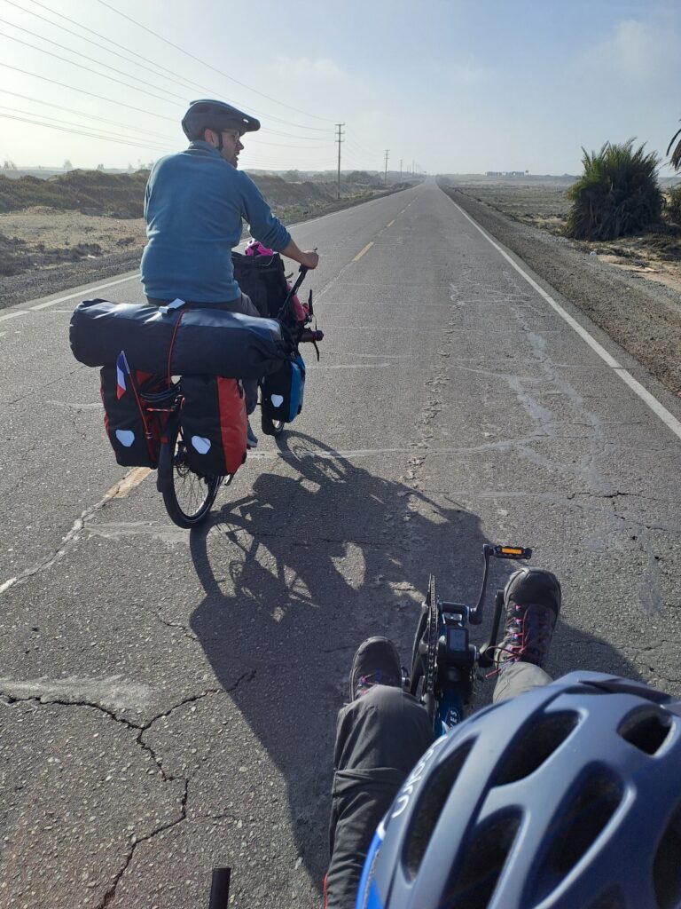 Il fait encore frais, les 10 premiers kilomètres sont avalés assez rapidement. L’ambiance change dès que nous commençons à rouler sur la Panaméricaine. Camions, bus, voitures en tout genre. Tout ce petit monde roule vite. Heureusement, nous nous sentons en sécurité sur la petite voie qui longe cette autoroute.